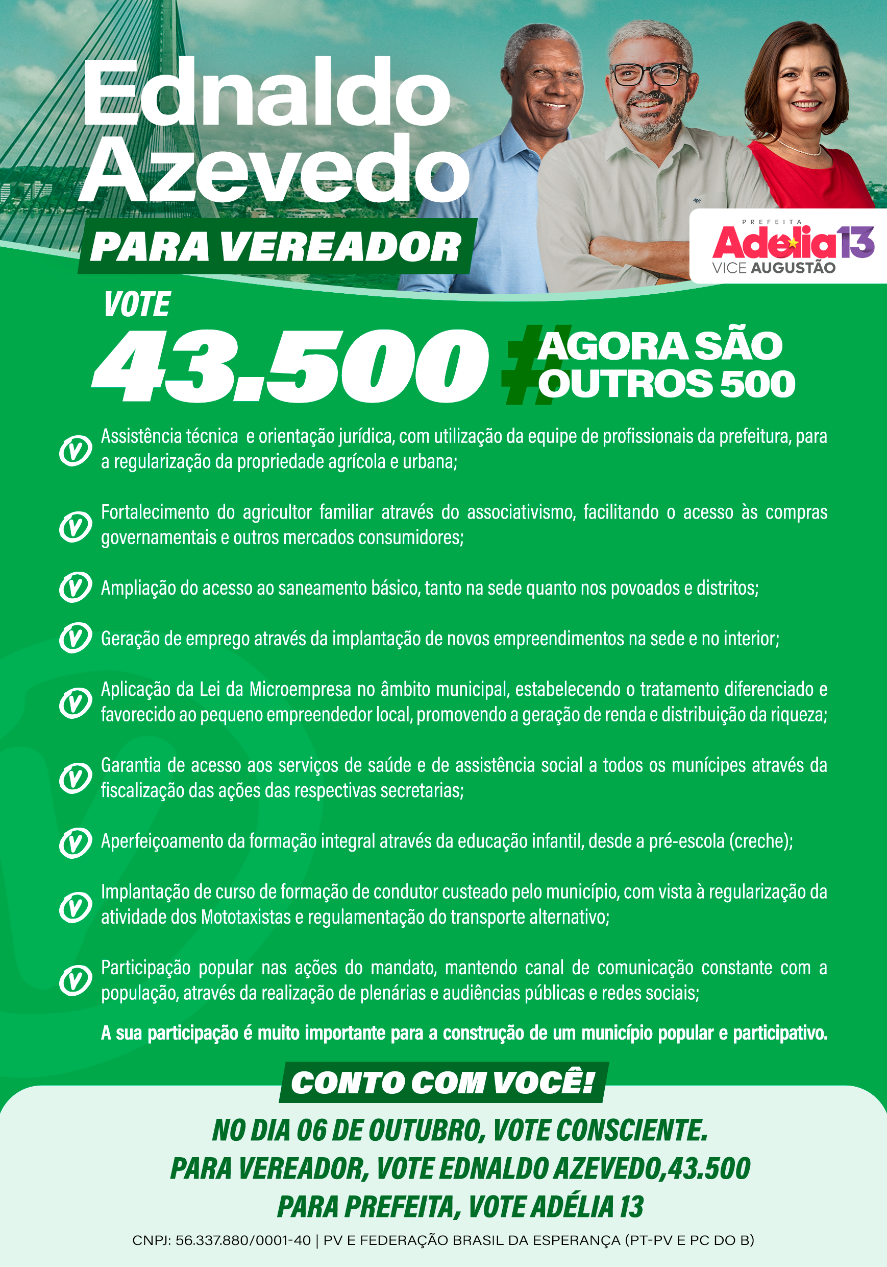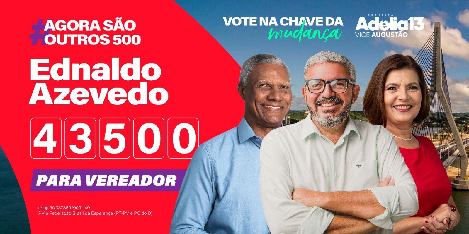 Ilhéus tem uma oportunidade única de ter um governo que gosta e sabe cuidar de gente. No dia 06 de outubro vote Ednaldo Azevedo 43.500 para vereador e Adélia 13 para prefeita. Ilhéus vai virar a chave 🔑 porque agora são outros 500. Que venham os próximos 500 anos com desenvolvimento, zelo e respeito pela população!!!